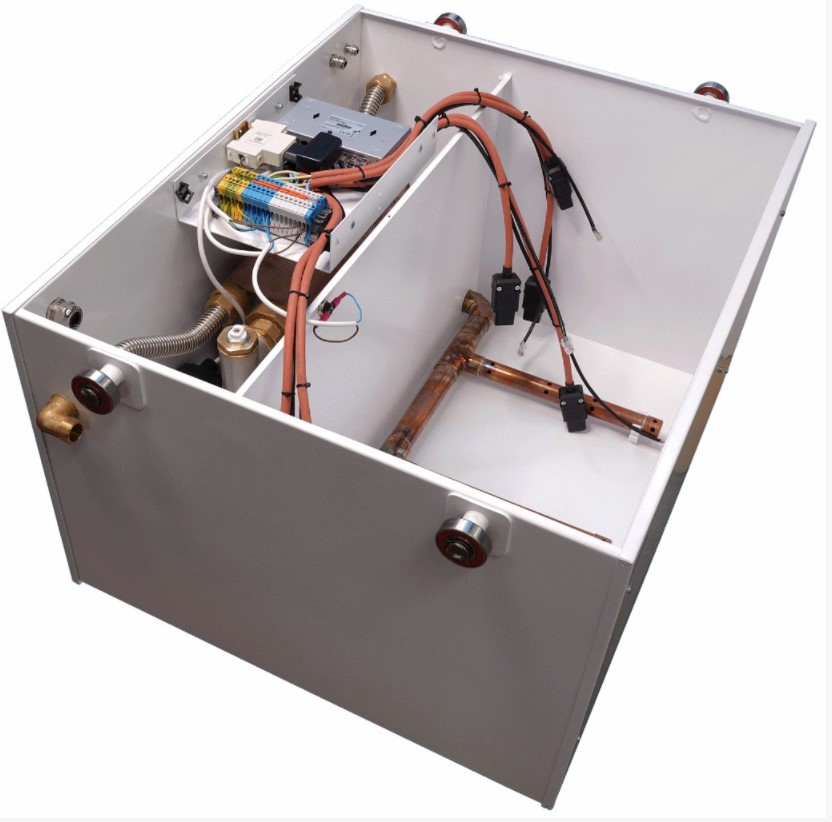 В комплектацию оборудования входят: тепловая защита от перегрева, электрический щит с автоматикой, гидравлическая обвязка ванны и градирни, распределительная электромонтажная панель ванны, ванна, насос для внутреннего контура, теплообменник 24кВт, коммутатор(свитч), 6 кабелей питания для ASIC, 6 кабеля Ethernet, вкладыши для размещения ASIC, сухая градирня с отводом до 25 кВт тепловой энергии.